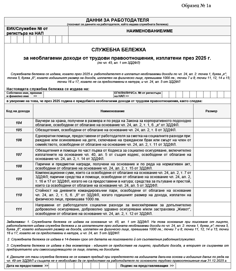 Образци на служебна бележка по член 45, алинея 1 от ЗДДФЛ (Образец 1 и Образец 1а) по ЗАПОВЕД ЗМФ-1099 от 28 ноември 2025 година